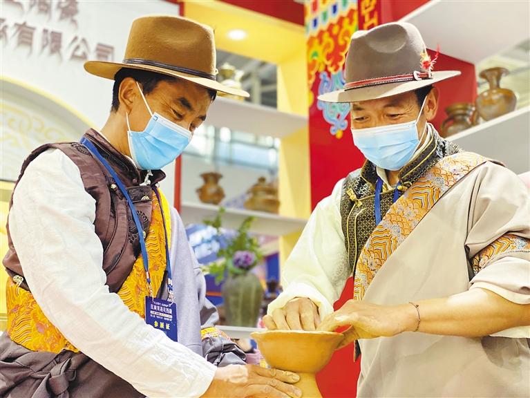 開幕式當(dāng)天,塔巴陶瓷展館內(nèi),非物質(zhì)文化遺產(chǎn)傳承人普旦扎西(左)與旦增晉美(右)在制作花瓶。
