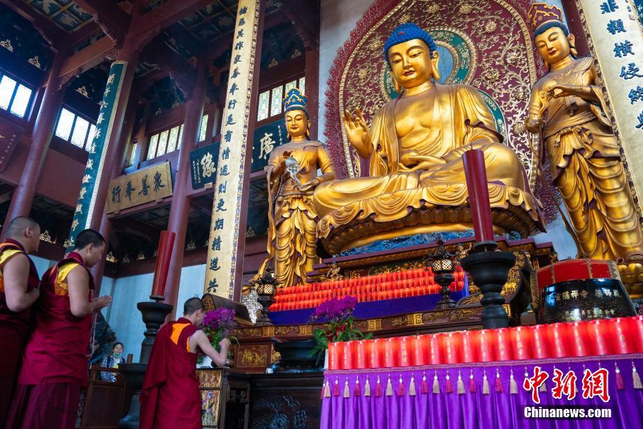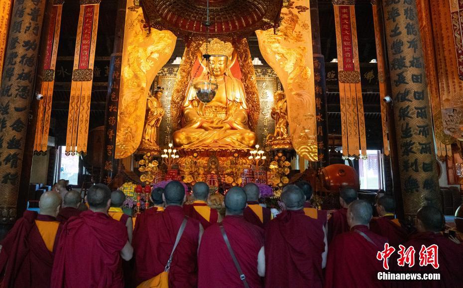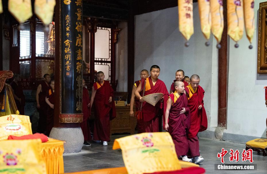 5月16日至18日,西藏少年活佛參學團赴浙江參觀學習,感受江南水鄉(xiāng)綿延的歷史人文底蘊。圖為5月16日,西藏少年活佛參學團在普陀山普濟禪寺誦經(jīng)禮佛。