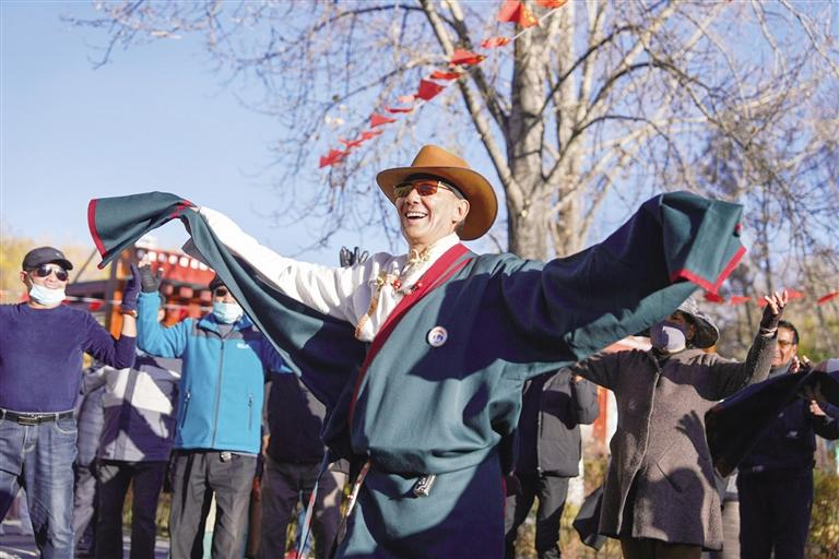 如今,隨著城鎮(zhèn)化發(fā)展,鍋莊漸漸融入人們的日常生活,成為很多人晨練和廣場舞的首選,刷新著人們對于傳統(tǒng)廣場舞的認(rèn)識?!拔覀兠褡宓膫鹘y(tǒng)舞蹈‘鍋莊’從農(nóng)牧區(qū)跳到城市,跳進(jìn)了大眾的日常生活,我感到很自豪?!眮碜阅乔械牡聭c卓瑪說。