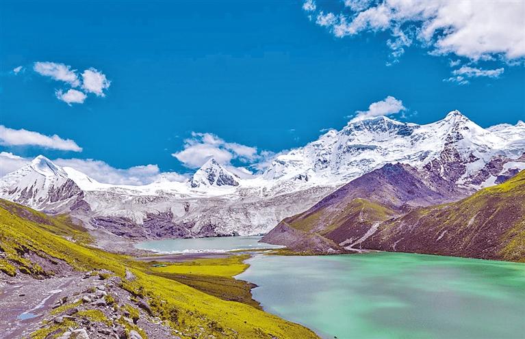 薩普雪山2016年才被發(fā)現(xiàn)并面世,是一處保護非常完整的天然冰川。其主峰海拔為6956米,北側有巨大的薩普冰川,冰川末端有一湖泊叫薩姆錯,海拔約4750米,薩姆錯分內、外湖,內湖為崗香童錯冰湖,終年不化,一年四季漂浮千年冰雕,形狀各異;外湖湖水碧綠,湖內魚兒成群。