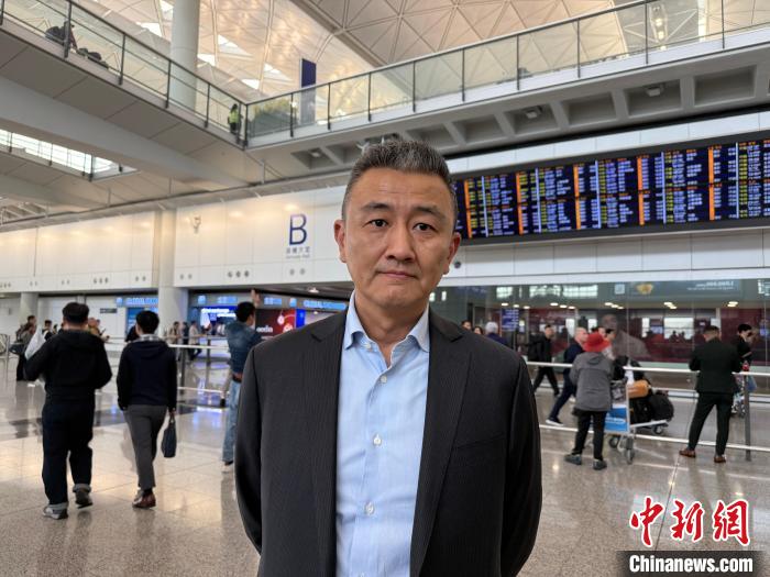 2月19日,西藏航空“拉薩-成都天府-香港”航線開通。圖為西藏航空副總經(jīng)理張兵兵在香港國際機(jī)場抵港大堂接受中新社記者采訪?!≈行律缬浾?韓星童 攝