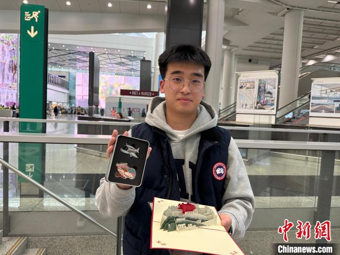 2月19日,西藏航空“拉薩-成都天府-香港”航線開通。圖為首航乘客曾帥向記者展示航空公司派發(fā)的首航紀(jì)念徽章和立體賀卡?!≈行律缬浾?韓星童 攝