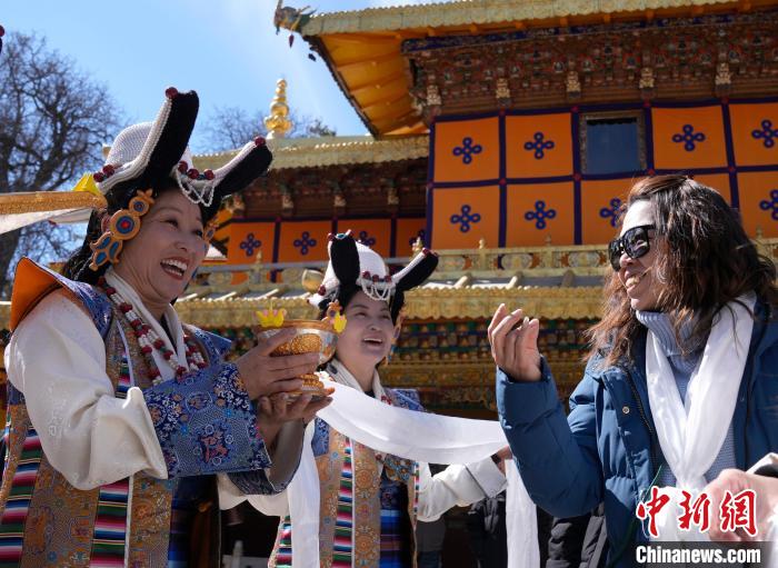 2月20日,2025年香港至拉薩航班首航旅行團(tuán)歡迎儀式現(xiàn)場,工作人員向香港游客敬獻(xiàn)青稞酒。李林 攝