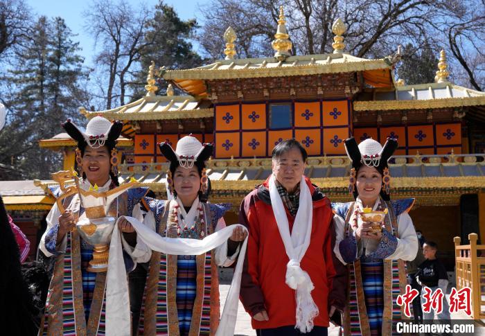 2月20日,2025年香港至拉薩航班首航旅行團(tuán)歡迎儀式現(xiàn)場,香港游客梁籌庭(右二)在羅布林卡與身著拉薩傳統(tǒng)服飾的工作人員合影留念。李林 攝
