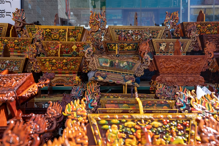 “老板,這個(gè)切瑪盒多少錢?便宜點(diǎn)我就拿走了?!薄斑@個(gè)圖案樣式都是精心雕刻的,最低1300元,實(shí)在不能再少了?!贝稳实牡赇伹?,不少顧客正在挑選“切瑪盒”,生意很是火爆?!扒鞋敽小笔菍⒕贫沸文竞杏酶舭宸珠_,左右兩邊分別盛入炒青稞和糌粑,再插上象征五谷豐登的“羅薩梅朵”和寓意吉祥的酥油花,寓意人壽年豐、吉祥如意,是藏歷新年家家戶戶必備的年貨之一。次仁告訴記者,“切瑪盒”根據(jù)圖案、顏料、大小、木材等因素,售價(jià)從幾百元到上千元不等,很多顧客普遍喜愛傳統(tǒng)樣式與圖案。