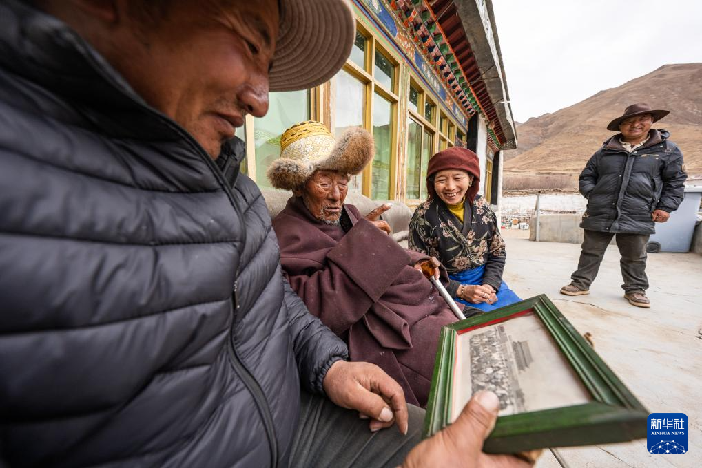 索扎老人和家人觀看當(dāng)年在天安門前拍的照片(3月20日攝)。新華社記者 丁增尼達 攝