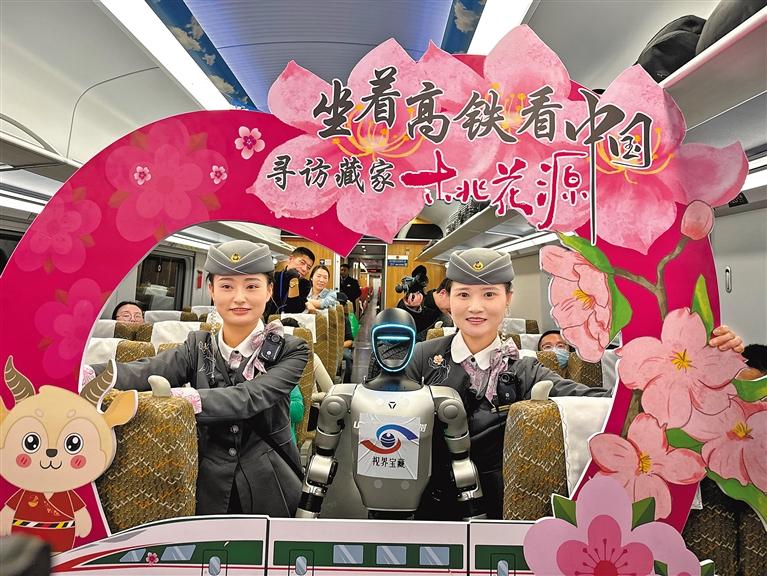 圖為拉林鐵路復興號動車組乘務員與機器人多吉合影。記者 文鳳 通訊員 馬生明 攝