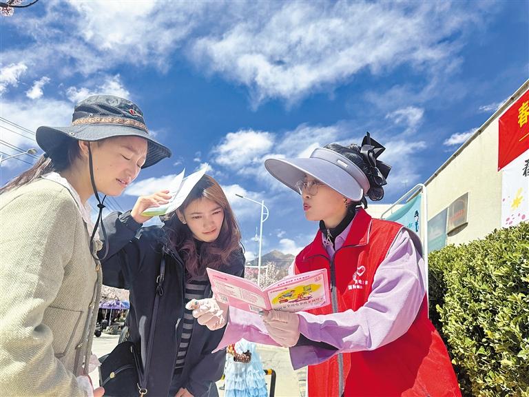 圖為志愿者正在為過往行人發(fā)放精心制作的家庭安全用電宣傳手冊。記者 拉巴桑姆 攝