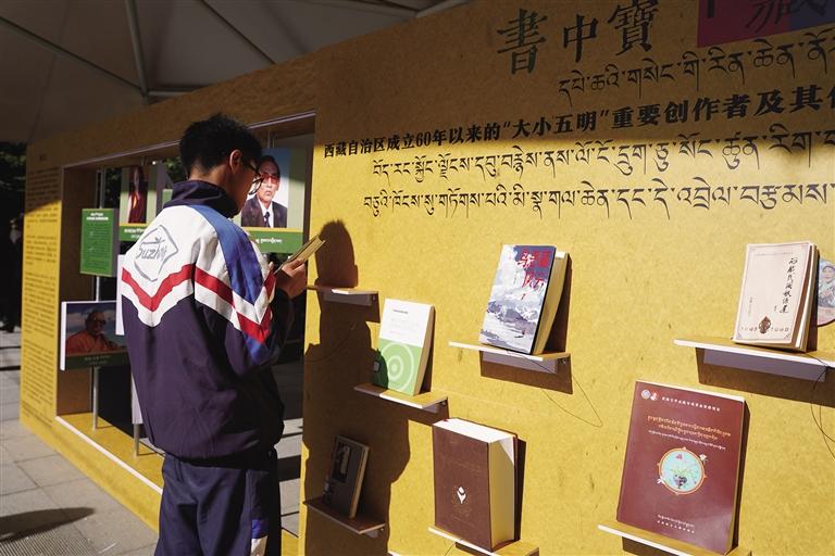 今年的書會展覽別具一格。在宗角祿康公園舉辦的“書中寶‘藏’——西藏自治區(qū)成立60年以來的重要作家與其著作”展覽,通過圖文、實物與互動相結(jié)合的創(chuàng)新方式,帶領觀眾回顧歷史,深入探尋西藏文化的深厚底蘊。從歷史文脈到當代審美,展覽呈現(xiàn)雙重維度——既追溯歷史又展現(xiàn)當下。吾要(嘎瑪·多吉次仁)書籍設計藝術(shù)展則首次在拉薩展示了這位國內(nèi)著名書籍設計師多年積累的各類作品,讓觀眾領略到書籍設計的獨特魅力。
