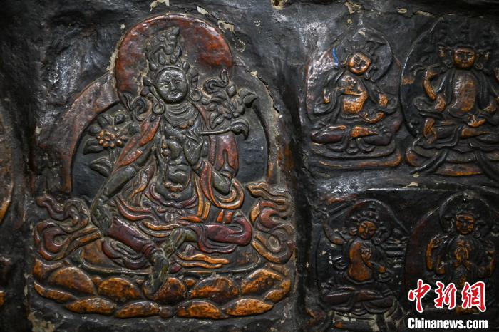 4月27日,記者探訪了當雄縣貢堂鄉(xiāng)沖嘎爾村康馬寺的瑪尼拉康?,斈崂凳窃撍鲁扌卸粗獾脑缙谧诮袒顒訄鏊彩撬略豪镒罟爬系慕ㄖ?。這里保存著令人驚嘆的石刻造像墻,這些石刻距今已有三百年歷史?,斈崂低庥^普通,但其室內(nèi)六面墻上整齊地貼滿了浮雕石刻板,共計1213塊(僅一塊缺失)。石刻內(nèi)容豐富,涵蓋了藏傳佛教各宗各派的本尊、祖師、佛母菩薩等,造型多姿多樣,線條清晰流暢。這處石刻造像墻對于研究西藏傳統(tǒng)雕刻、藏傳佛教以及歷史具有重大意義。中新社記者 貢嘎來松 攝