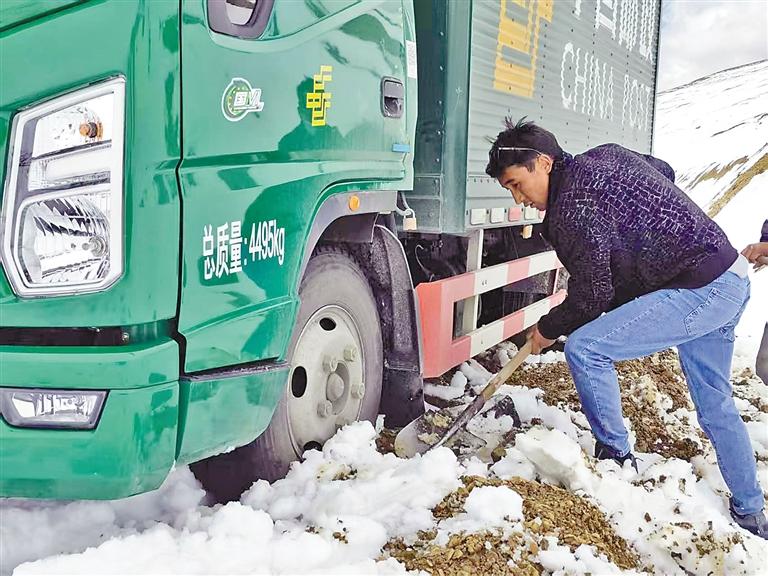 圖為巴桑頓珠在強(qiáng)拉山頂鏟雪,讓郵車脫困(資料照片)。