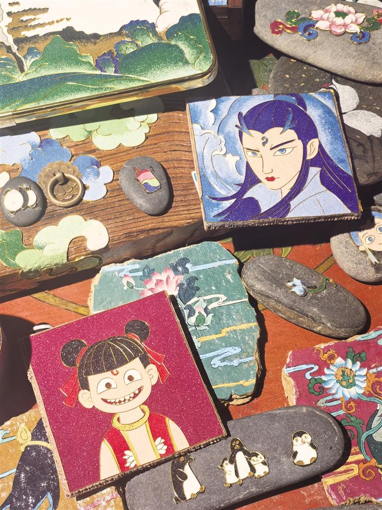 只見(jiàn)占地不到20平方米的小屋內(nèi),擺放著各類唐卡畫(huà)作。既有傳統(tǒng)唐卡作品,亦有動(dòng)畫(huà)人物的“繪像”。描邊的金屬絲和光滑的質(zhì)感表面讓人忍不住駐足欣賞。店里陳列著巴掌大小的掐絲唐卡,金線掐絲在礦物顏料映襯下流光溢彩。畫(huà)師兼老板的南吉合多杰正在完成一份岡仁波齊的客單:“勉薩畫(huà)派的特色是線條細(xì)膩,顏色過(guò)渡自然。選好圖案后,會(huì)根據(jù)載體材質(zhì)、大?。ɡ缡^大小、木板長(zhǎng)短等)收費(fèi)?!彼贿呎f(shuō)著,一邊用特制工具將顏料注入金絲隔斷。