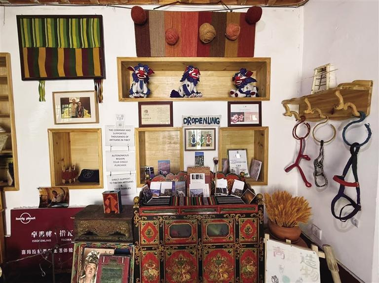 進(jìn)入卓番林,只見(jiàn)狹長(zhǎng)的店面內(nèi)琳瑯滿目地?cái)[著各類富有藏元素的物件,里側(cè)的木質(zhì)貨架上整齊掛著多條不同顏色和格紋樣式的織物,貨架上方擺放著展示手工編織過(guò)程的照片。工作人員告訴記者,這些都是可售賣的,除此之外,游客來(lái)到這里,還可以體驗(yàn)酥油香皂、酥油唇膏、藏式刺繡等手工DIY。