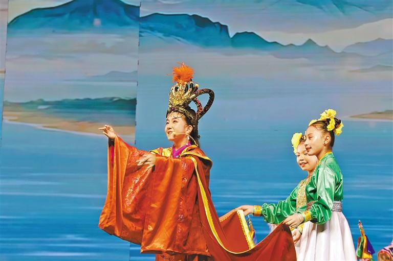 舞臺中央,12歲的其美卓嘎身著錦繡華服,以清亮唱腔和靈動演繹,將文成公主的溫婉堅毅展現(xiàn)得淋漓盡致?!爱斘掖┥蠎蚍⒊稹疂h藏情誼潔如璧’時,仿佛真的穿越到千年前的和親之路?!毖莩鼋Y(jié)束后,小姑娘眼中閃爍著興奮的光芒,“原來民族團結(jié)的故事,就藏在這些古老而動人的戲文里?!逼涓赣H倫珠難掩自豪:“文成公主促進了漢藏交融,女兒能表演這個節(jié)目,用藏戲詮釋民族團結(jié),是我們?nèi)业尿湴?!?/p>