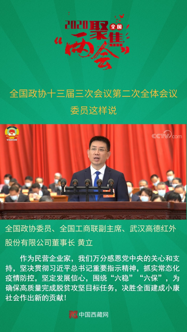全國政協(xié)委員、全國工商聯(lián)副主席、武漢高德紅外股份有限公司董事長黃立發(fā)言說,作為民營企業(yè)家,我們?nèi)f分感恩黨中央的關(guān)心和支持,堅決貫徹習近平總書記重要指示精神,抓實常態(tài)化疫情防控,堅定發(fā)展信心,圍繞“六穩(wěn)”“六?!?,為確保高質(zhì)量完成脫貧攻堅目標任務,決勝全面建成小康社會作出新的貢獻!
