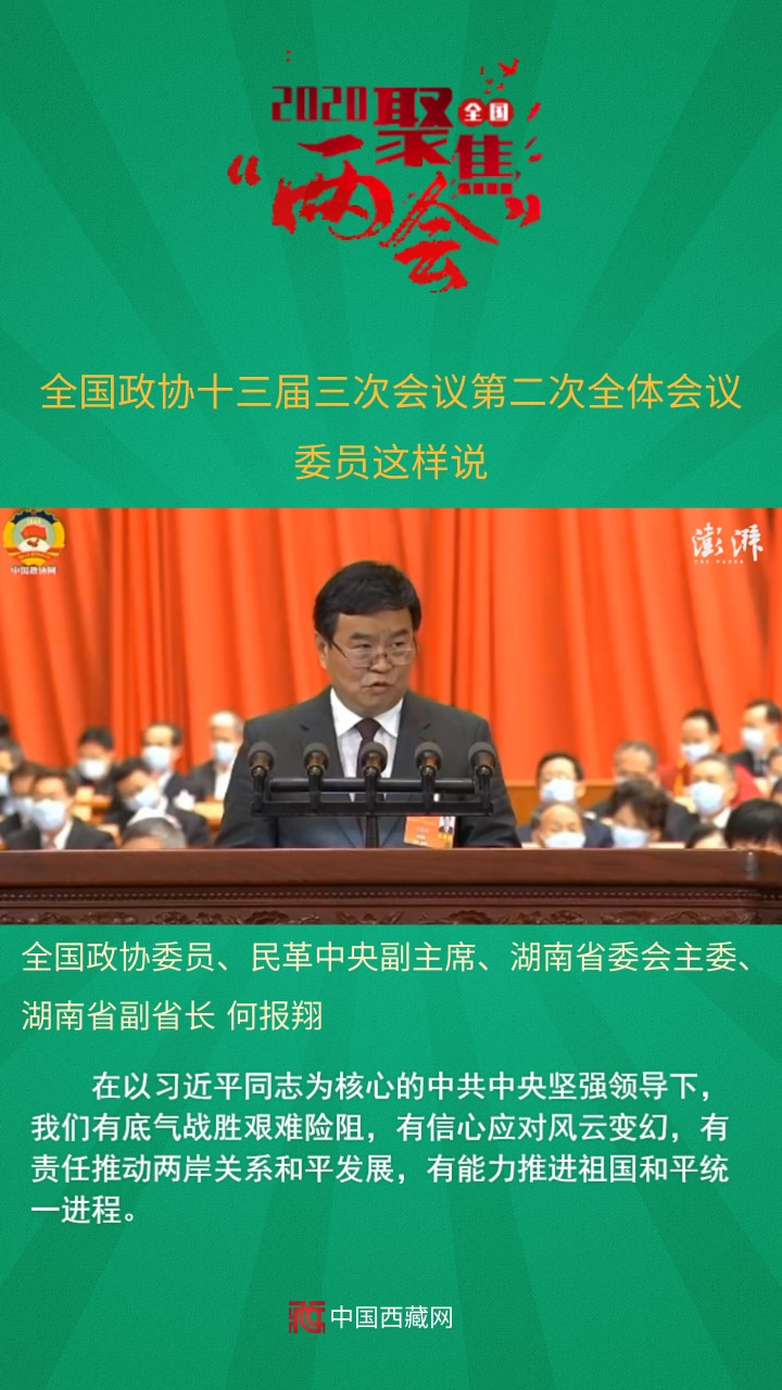 全國政協(xié)委員、民革中央副主席、湖南省委會主委、湖南省副省長何報翔發(fā)言說,在以習近平同志為核心的中共中央堅強領導下,我們有底氣戰(zhàn)勝艱難險阻,有信心應對風云變幻,有責任推動兩岸關(guān)系和平發(fā)展,有能力推進祖國和平統(tǒng)一進程。