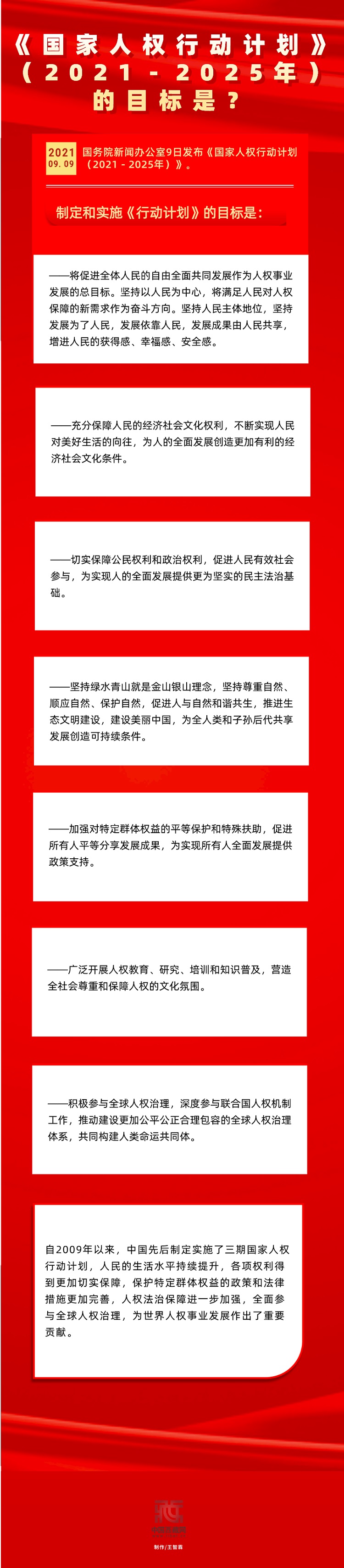 9月9日,國務(wù)院新聞辦公室發(fā)布《國家人權(quán)行動(dòng)計(jì)劃(2021-2025年)》,確定2021-2025年尊重、保護(hù)和促進(jìn)人權(quán)的階段性目標(biāo)和任務(wù)[詳細(xì)] -