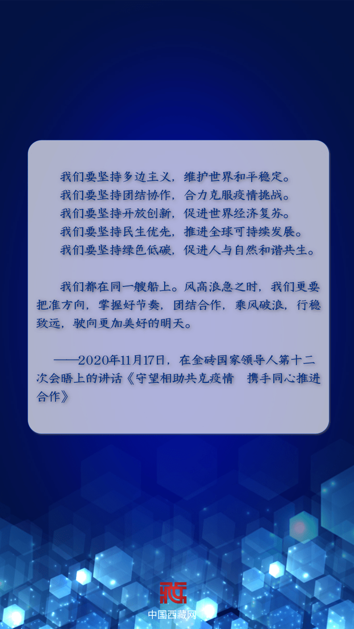 讓我們攜起手來,堅持和平、發(fā)展、合作、共贏,共同解決當(dāng)前世界經(jīng)濟以及國際貿(mào)易和投資面臨的問題,一起走向更加美好的未來! [詳細(xì)]