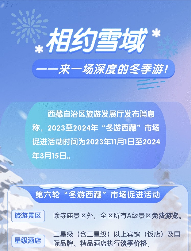 西藏自治區(qū)旅游發(fā)展廳發(fā)布消息稱,2023至2024年“冬游西藏”市場促進活動時間為2023年11月1日至2024年3月15日。[詳細] -