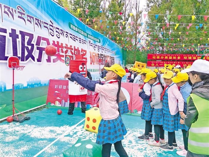在拉薩市城關區(qū)組織開展的“不忘初心、牢記使命”主題教育暨“垃圾分類黨員先行 守護凈土人人有責”活動現(xiàn)場,學生代表參加趣味游戲。
