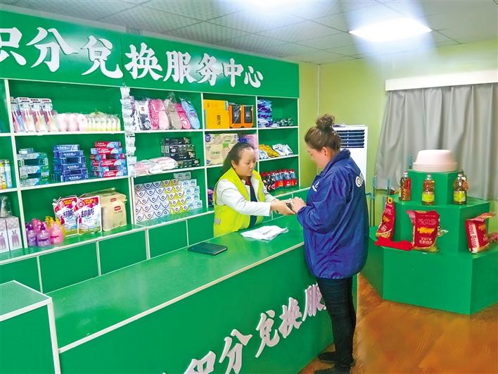 城關區(qū)嘎瑪貢桑街道辦事處統(tǒng)建社區(qū)居民在垃圾分類積分兌換超市兌換生活用品。