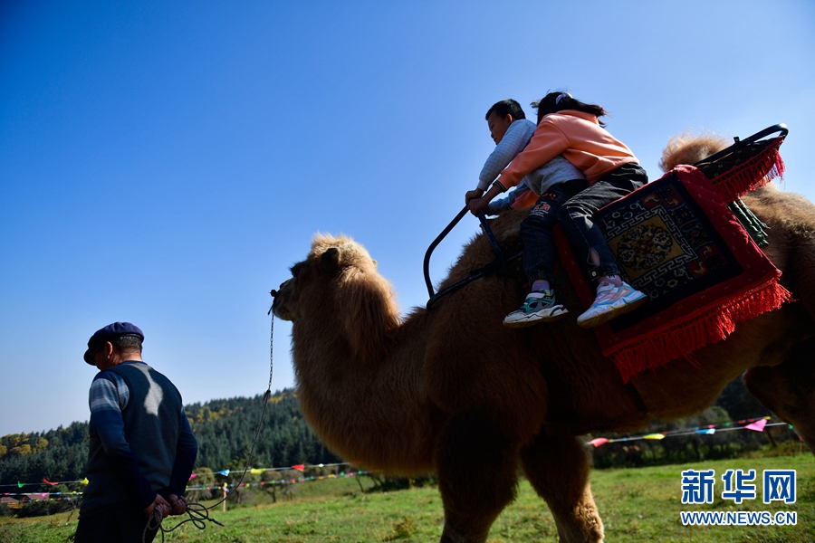 游客在青海省西寧市湟中區(qū)攔隆口鎮(zhèn)卡陽村景區(qū)內(nèi)體驗(yàn)騎駱駝。新華社記者 張龍 攝
