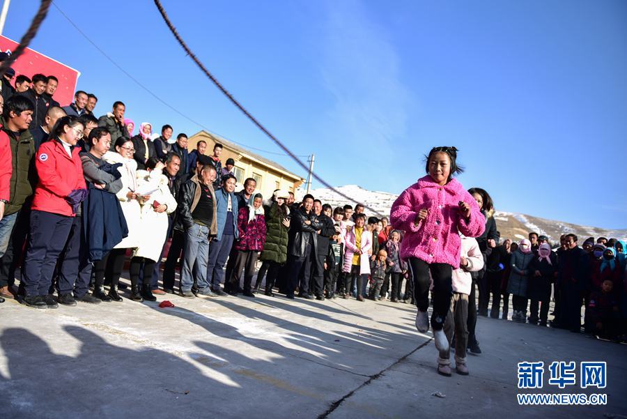在海東市互助縣丹麻鎮(zhèn),村民們?cè)趨⒓蛹w跳繩比賽。新華社記者 吳剛 攝