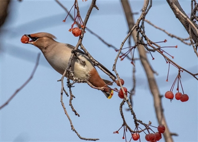 記者從省動(dòng)物學(xué)會(huì)鳥(niǎo)類(lèi)學(xué)分會(huì)成員胡老師處了解到,11月24日下午他也在海棠公園觀(guān)賞太平鳥(niǎo),從比例估算這次大約有一千多只太平鳥(niǎo)飛來(lái)海棠公園,是近年來(lái)出現(xiàn)鳥(niǎo)兒最多的一年。去年海棠公園出現(xiàn)了約三百多只太平鳥(niǎo),2017年、2018年它們出現(xiàn)的比較分散,在南山公園、寧湖濕地公園、海棠公園都有出現(xiàn),每處數(shù)量也只有五六十只,2018年在大通濱河公園也出現(xiàn)過(guò),數(shù)量有二三十只左右。太平鳥(niǎo)在青海早就有記錄,太平鳥(niǎo)為鳥(niǎo)綱太平鳥(niǎo)科、體長(zhǎng)約18厘米、壽命約13年左右。它們喜歡吃漿果,所以海棠果也就成為了它們的美味佳肴,春天也吃垂柳嫩葉,一般棲息于針葉、闊葉混交林中。
