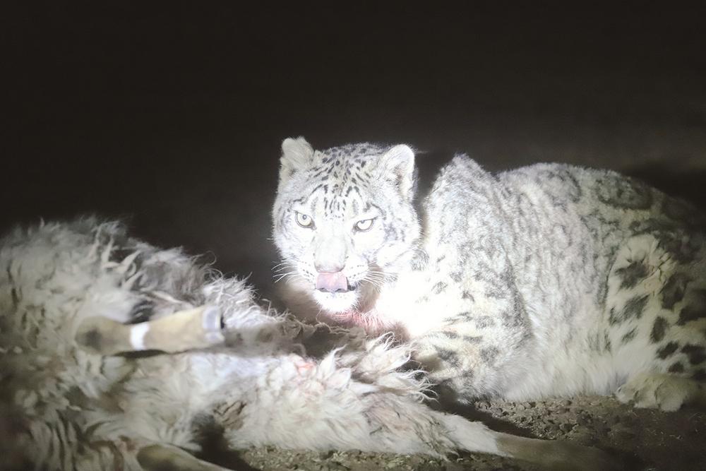 “是雪豹!”隨著手電筒光束的照射,圖松和朋友看到一只成年雪豹正在撕咬一只羊。