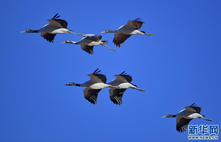 黑頸鶴在自然保護(hù)區(qū)上空飛翔(2021年1月3日攝)。新華社記者 張汝鋒 攝