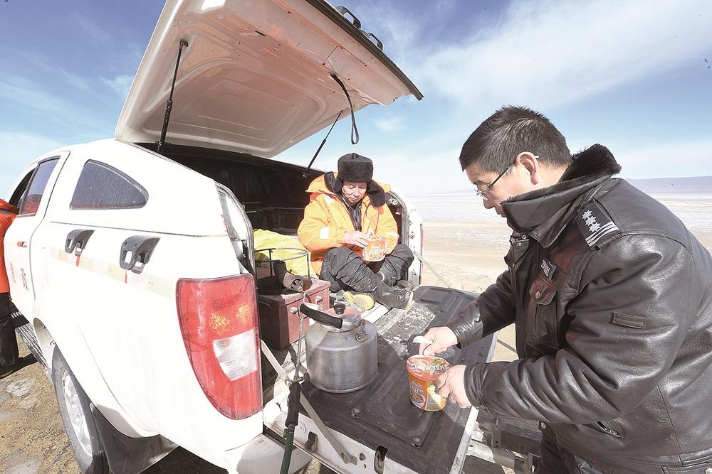同事們前去巡查后不久,她們也開(kāi)始忙碌起來(lái),為隊(duì)員們準(zhǔn)備“豐盛的午餐”——泡面。平常再簡(jiǎn)單不過(guò)的燒開(kāi)水,在寒風(fēng)凜冽的青海湖邊卻異常艱難。