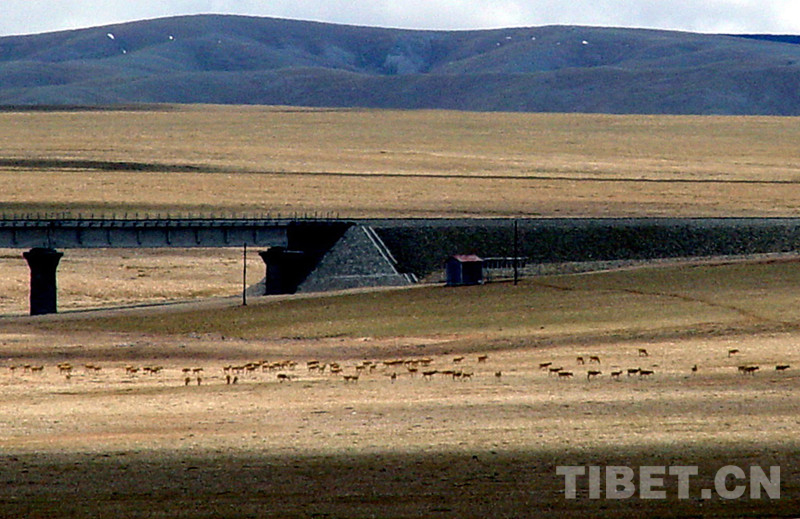 藏北高原,在藏語里稱為“羌塘”。這里棲息著的藏羚羊,每年春夏季都會(huì)大規(guī)模由南向北長(zhǎng)距離遷徙,五道梁至楚瑪爾河一帶是必經(jīng)之路。為了保證藏羚羊自由遷徙,青藏鐵路在這里設(shè)立了四處野生動(dòng)物通道。其中長(zhǎng)11.7公里的清水河特大橋和長(zhǎng)4公里的楚瑪爾特大橋,采取“以橋代路”形式設(shè)計(jì)動(dòng)物通道,供野生動(dòng)物通過。