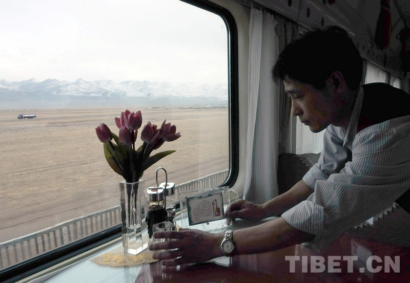 圖為全部為密封車窗,以防旅客投擲雜物。在通過藏北高原時(shí),一位餐車人員正在整理餐桌(唐召明2014年攝)