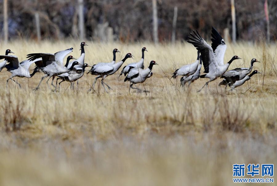 冬季,成群結(jié)隊(duì)的黑頸鶴遷徙到西藏林芝市,雅魯藏布江及江畔的農(nóng)田成了它們?cè)蕉臉?lè)園。