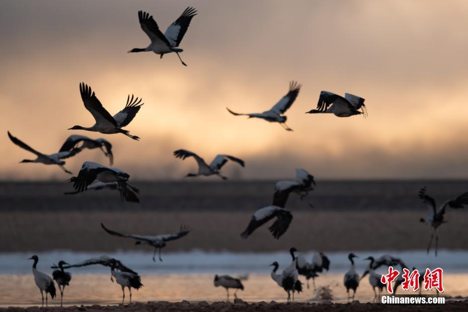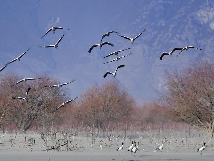 冬季,成群結(jié)隊(duì)的黑頸鶴遷徙到西藏林芝市,雅魯藏布江及江畔的農(nóng)田成了它們?cè)蕉臉?lè)園。[詳細(xì)] -