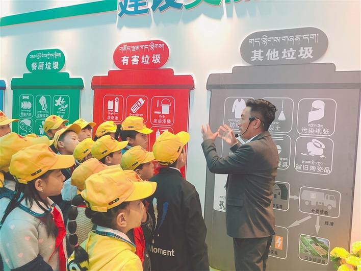 拉薩市城關(guān)區(qū)環(huán)衛(wèi)局局長米瑪次仁向?qū)W生介紹垃圾分類常識