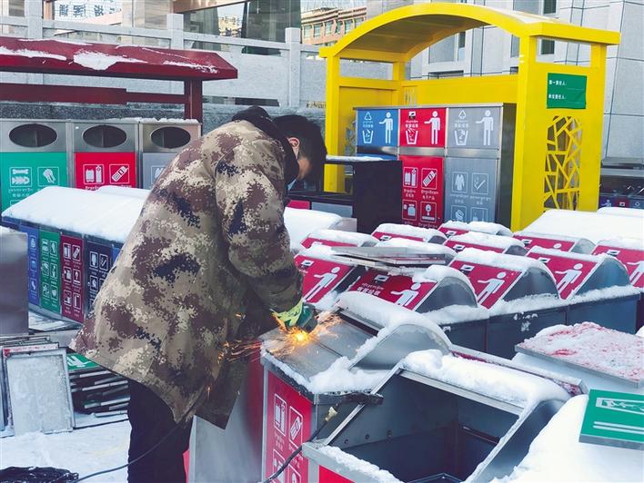 工作人員在組裝垃圾分類設(shè)施