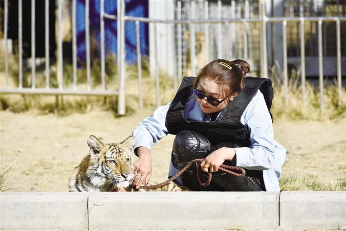 當(dāng)記者看到四只幼獅時(shí),它們時(shí)而聚在一起,時(shí)而沿著籠子邊溜達(dá),時(shí)而張開(kāi)大嘴向著外人示威,還有一個(gè)非?;钴S的在攀爬籠子。小老虎次仁卓瑪雖然沒(méi)有兄弟姐妹的陪伴,不過(guò)園區(qū)的獸醫(yī)小姐姐成了它最貼心的玩伴。每天,獸醫(yī)小姐姐都會(huì)帶著次仁卓瑪進(jìn)行戶外活動(dòng),次仁卓瑪像小朋友一樣喜歡玩皮球,喜歡追著獸醫(yī)小姐姐跑,還特別喜歡獸醫(yī)小姐姐給它按摩,經(jīng)常會(huì)撒嬌求抱抱。