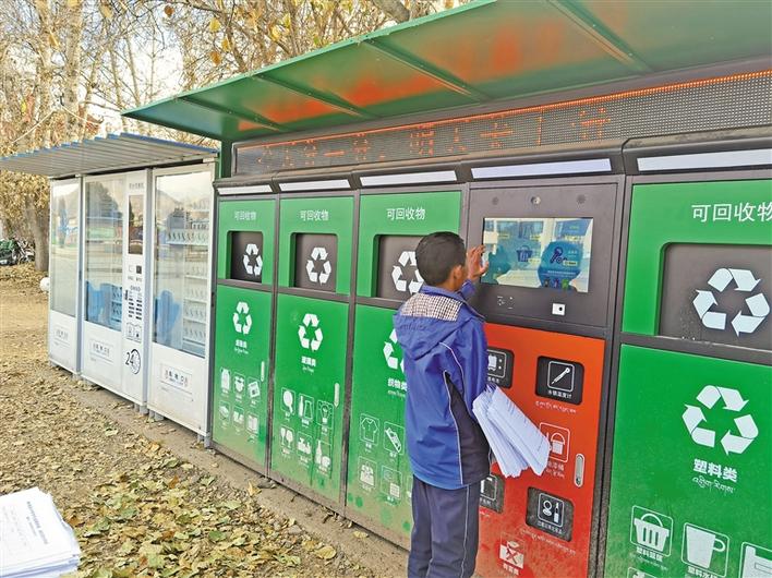 記者在林周縣城部分小區(qū)和學(xué)校內(nèi)看到,安裝的智能垃圾分類設(shè)備已全部投入使用,智能分類回收箱箱體上標注著“紙張”“塑料”“金屬”等各類名稱。學(xué)生們只要在設(shè)備端口掃描校園班級卡上的二維碼,把廢紙、塑料瓶等垃圾依次分類放入“智能回收箱”,垃圾分類箱便會根據(jù)投放的垃圾自動稱重計算積分,并在學(xué)生的校園班級卡賬戶上增加相應(yīng)的“垃圾兌換積分”,使用積分就可以在平臺兌換作業(yè)本、紙筆等學(xué)習(xí)用品。