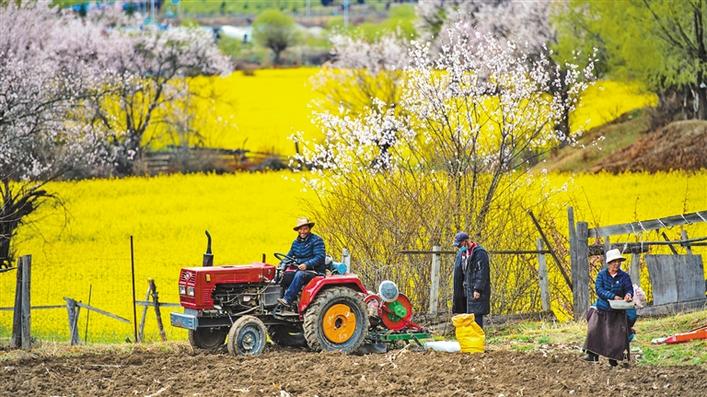 日前,林芝市巴宜區(qū)布久鄉(xiāng)朵當村群眾駕駛農用機械犁地,與遠處桃花和油菜花構成一幅秀美田園風光圖。