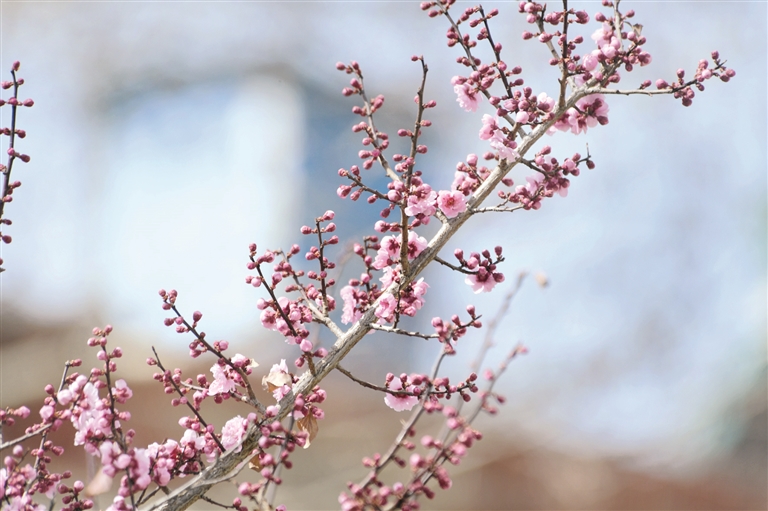 公園里粉嫩剔透的桃花。