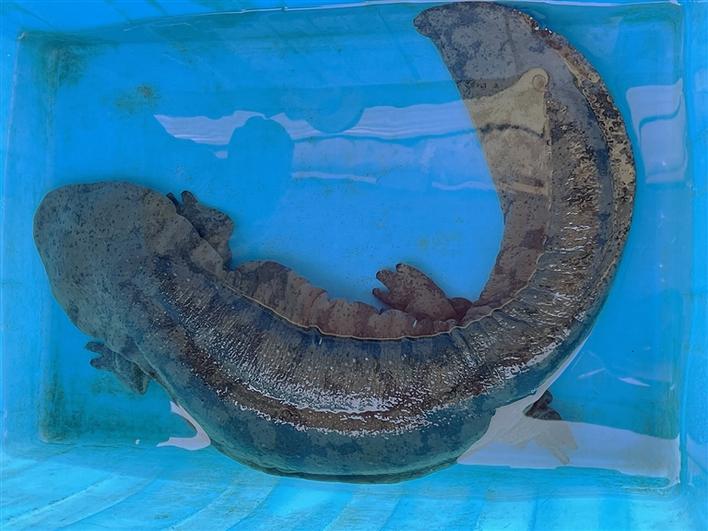 到達該店時,水產(chǎn)店老板宋保齊正在給“娃娃魚”喂食小魚,這條“娃娃魚”重14斤,長約95厘米。記者向宋先生了解了初遇“娃娃魚”的情況。宋保齊回憶起來還歷歷在目,他說:“清明節(jié)的時候,我和朋友們正在拉薩河曲水段游玩,意外在岸上發(fā)現(xiàn)了它,雖然我是賣水產(chǎn)的,但是當(dāng)時也不能十分確定它是否就是‘娃娃魚’,然后我們就把它帶回了自家水產(chǎn)店飼養(yǎng),在網(wǎng)上查看才確定它就是‘娃娃魚’,也是國家二級保護動物,便聯(lián)系相關(guān)部門,希望能把它放歸大自然。”