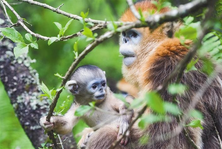 神農(nóng)架國(guó)家公園動(dòng)物保護(hù)人員經(jīng)過(guò)多年的努力,加之當(dāng)?shù)厣鷳B(tài)環(huán)境的不斷改善,神農(nóng)架金絲猴由上世紀(jì)80年代的501只擴(kuò)大到現(xiàn)在的3個(gè)金絲猴大種群9個(gè)小種群,總數(shù)達(dá)到1471只。 這是5月19日在神農(nóng)架國(guó)家公園大龍?zhí)督鸾z猴野外研究基地山林中拍攝的金絲猴。 新華社記者 肖藝九 攝