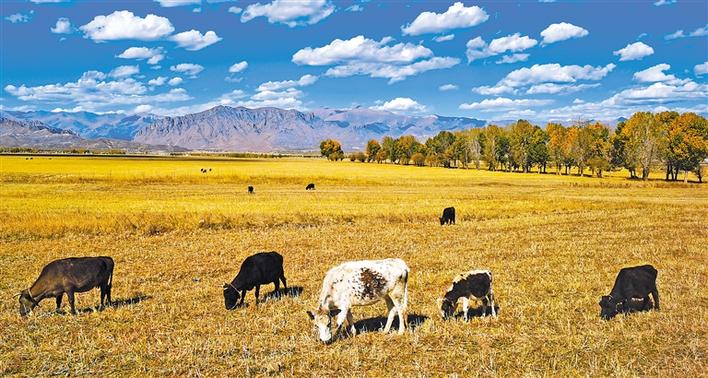 秋日的雪域高原魅力無限,藍(lán)天、白云、黃葉、碧水、雪山及金色草原交相輝映,宛如一幅幅色彩繽紛的優(yōu)美畫卷。