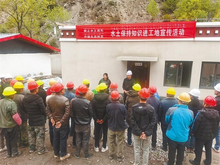 圖為林芝市水利局工作人員在朗縣拉多鄉(xiāng)項(xiàng)目工地向一線工人和管理人員宣傳水土保持知識(shí)。記者 張猛 攝