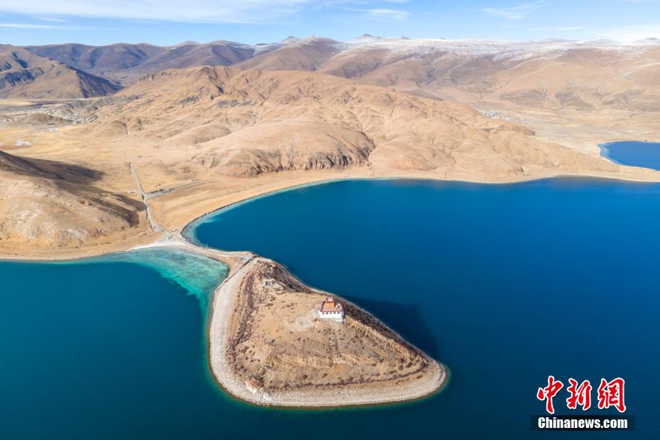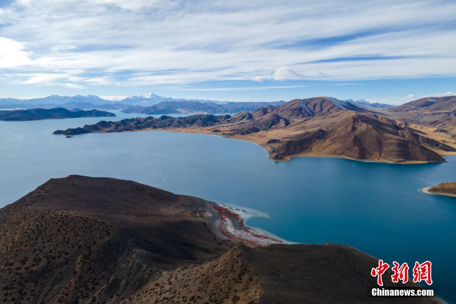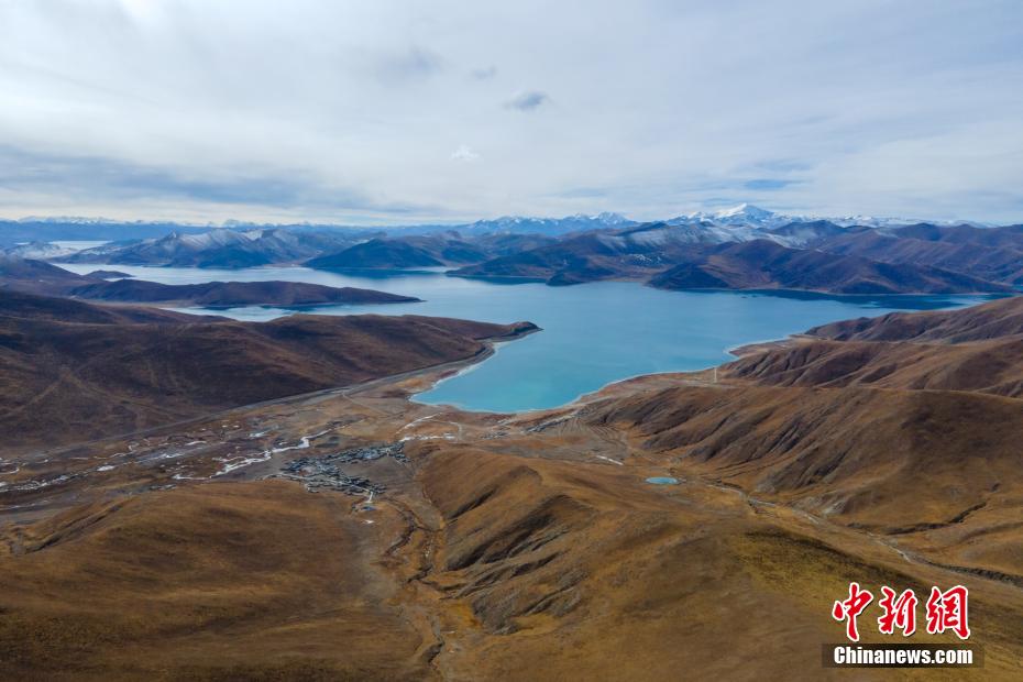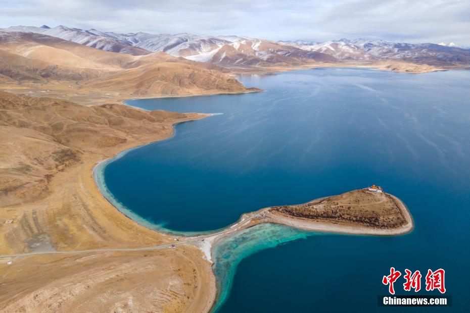 12月28日,羊卓雍錯湖岸風光。羊卓雍錯藏語意為“碧玉湖”,與納木錯、瑪旁雍錯并稱西藏三大“圣湖”。羊卓雍錯湖面海拔4441米,東西長130公里,南北寬70公里,湖岸線總長250多公里。28日,中新網記者自駕前往羊卓雍錯,翻過山口,到達湖岸東北面的日托寺,沿途盡是冬日高原湖光山色之美,無人機航拍鏡頭下,遠處雪山、冰川巍峨屹立,堪稱絕美。 江飛波 攝