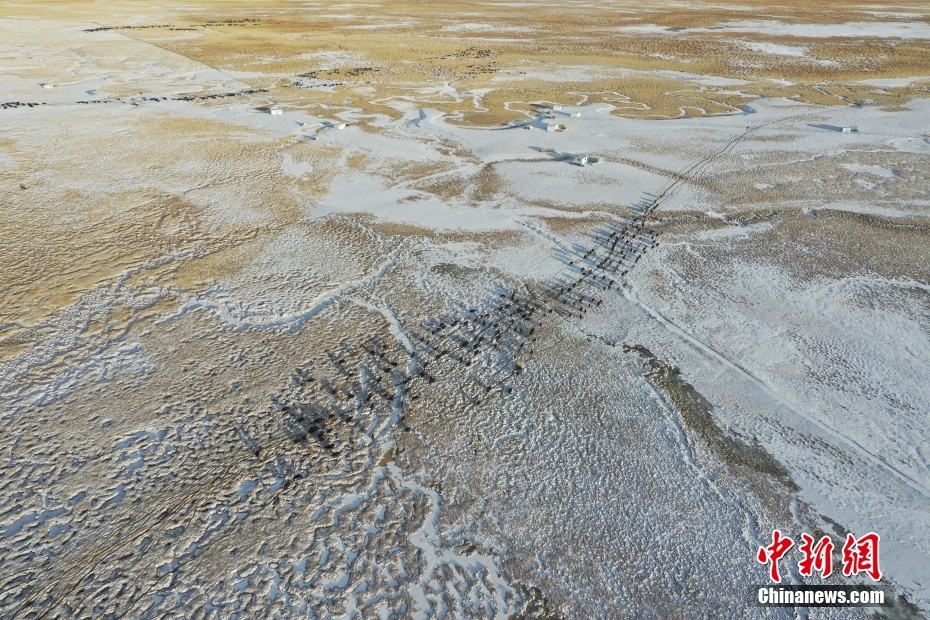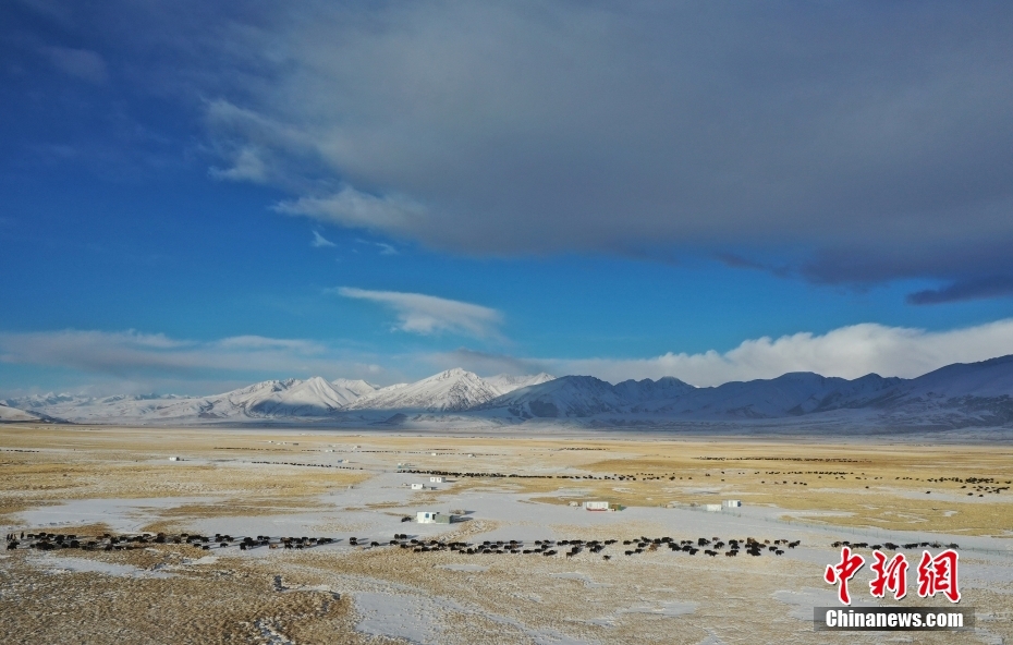 1月27日,當(dāng)雄縣龍仁鄉(xiāng)烏達(dá)村牧民趕著牛羊去牧場(chǎng)。當(dāng)雄縣位于西藏自治區(qū)拉薩市北部,距拉薩市區(qū)170公里?!爱?dāng)雄”,藏語(yǔ)意為“天選牧場(chǎng)”,平均海拔約4200米,草場(chǎng)廣闊,土地肥沃。(無(wú)人機(jī)照片) 中新社記者 貢嘎來(lái)松 攝
