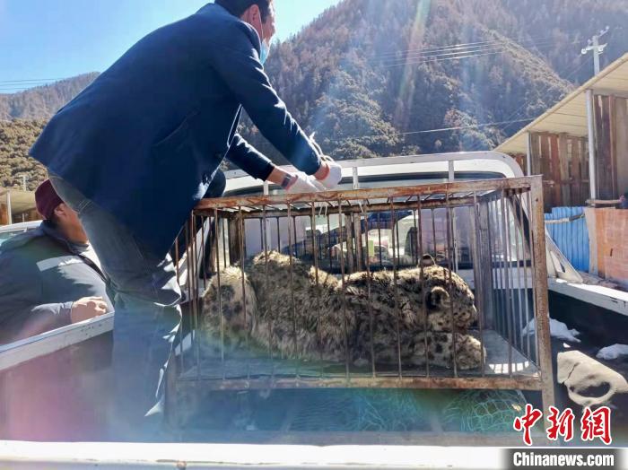 圖為工作人員將雪豹運(yùn)送至林芝市野生動物收容救護(hù)站?!×种ナ辛植菥止﹫D