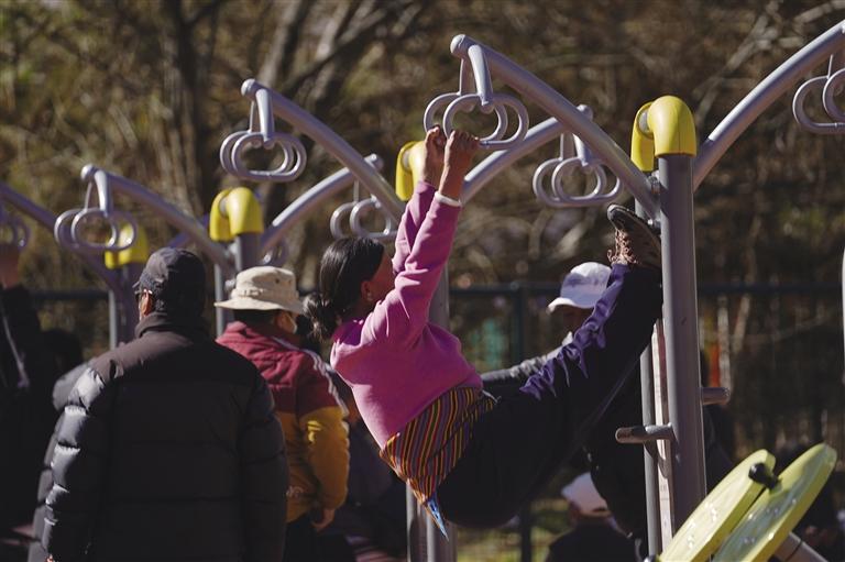 漫步公園,到處都是人們晨練的身影。太極、柔力球、廣場(chǎng)舞,清晨的宗角祿康公園十分熱鬧。在公園一角,還有人在跳鍋莊舞,他們隨著音樂,一會(huì)兒扭胯、一會(huì)兒踢腿、一會(huì)兒擺手……個(gè)個(gè)精神飽滿。