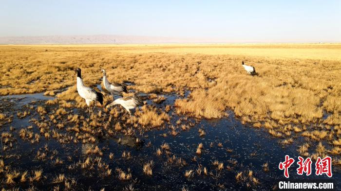 圖為柴達木盆地內(nèi)的野生黑鶴?!跆m縣委宣傳部 供圖